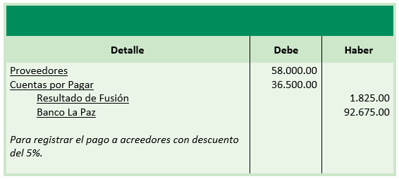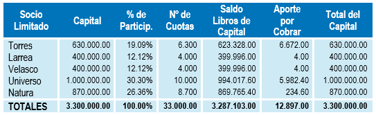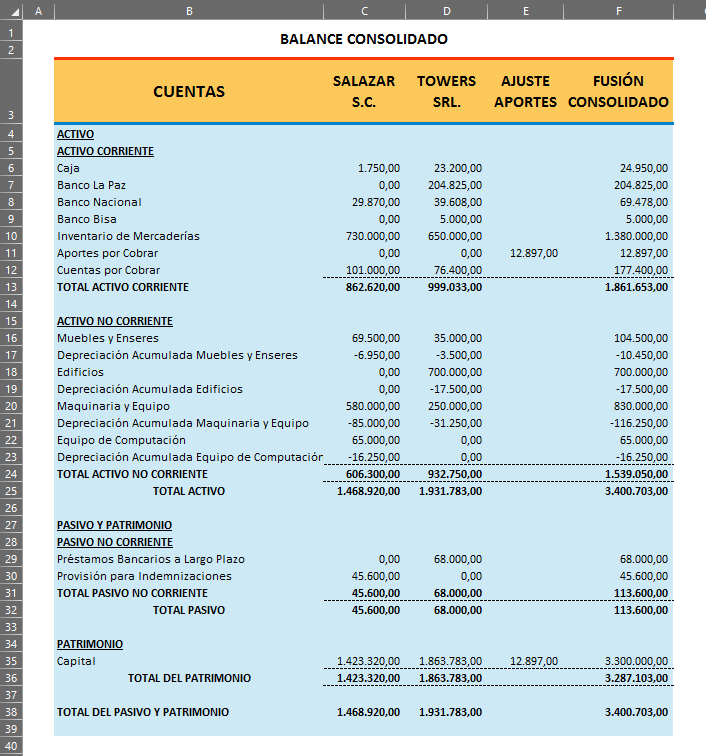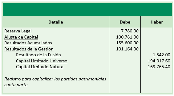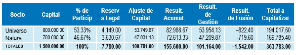 Dando cumplimiento a los acuerdos preliminares y para consolidar la fusión entre las empresas Torres S.C. y Universo S.R.L., incorporándose la primera a la segunda, se tiene, previo a la fusión, los siguientes saldos ajustados al 31 de diciembre de 2015:
