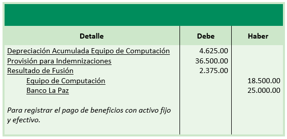 3) Indemnizar beneficios sociales. Se realiza entregando el equipo de computación y el saldo con cheque del Banco La Paz por un valor de $ 25.000.